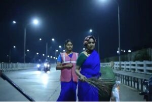 இரவு நேரத்தில், சக பணியாளர்களுடன் சேர்ந்து நகரைச் சுத்தப்படுத்தும் பணியில் ஈடுபடுகிறார்.