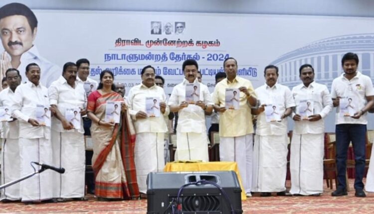 மக்களவைத் தேர்தலையொட்டி திமுக உருவாக்கியுள்ள தேர்தல் அறிக்கையை முதலமைச்சர் மு.க.ஸ்டாலின் அண்ணா அறிவாலயத்தில் வெளியிட்டார்.