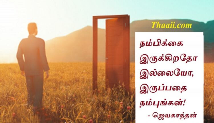 நம்மிடம் இருப்பதை நம்புவோம்! கதம்பம் Last updated May 4, 2024 Share தாய் சிலேட்: நம்பிக்கை இருக்கிறதோ இல்லையோ, இருப்பதை நம்புங்கள்! – ஜெயகாந்தன் Jeyakanthan factsஜெயகாந்தன் Share FacebookTwitterGoogle+ReddItWhatsAppPinterestEmail