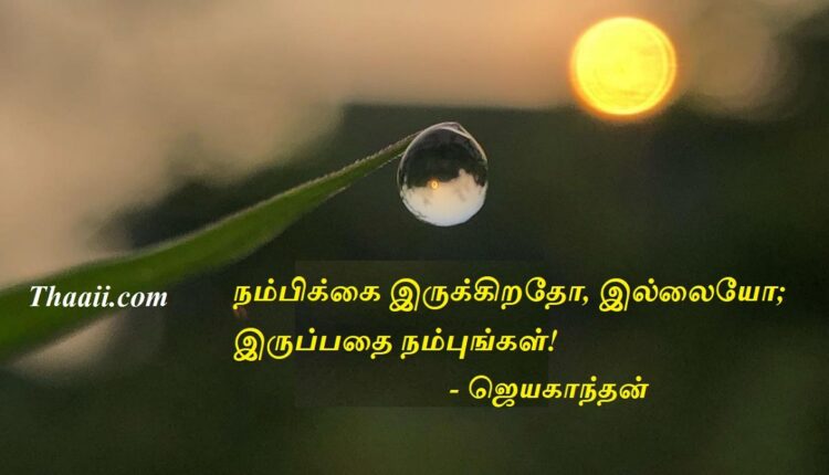 இருப்பதை நம்புங்கள்! கதம்பம் Last updated Jun 18, 2024 Share தாய் சிலேட்: நம்பிக்கை இருக்கிறதோ இல்லையோ இருப்பதை நம்புங்கள்! – ஜெயகாந்தன் writer jayakanthan quotesஜெயகாந்தன் Share FacebookTwitterGoogle+ReddItWhatsAppPinterestEmail