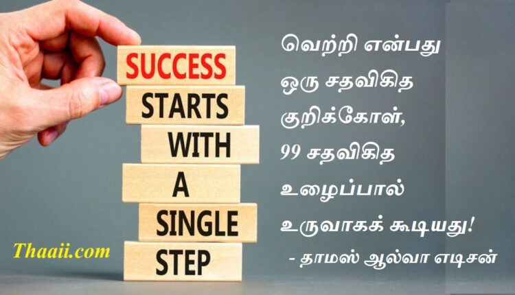 இலக்கும் உழைப்பும் வெற்றிக்கு அடிப்படை! கதம்பம் Last updated Feb 20, 2025 Share தாய் சிலேட்: வெற்றி என்பது ஒரு சதவிகித குறிக்கோள், 99 சதவிகித உழைப்பால் உருவாகக் கூடியது! – தாமஸ் ஆல்வா எடிசன் Share FacebookTwitterGoogle+ReddItWhatsAppPinterestEmail