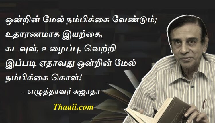 ஏதாவது ஒன்றின் மேல் நம்பிக்கை கொள்! கதம்பம் Last updated Feb 27, 2025 Share தாய் சிலேட்: ஒன்றின் மேல் நம்பிக்கை வேண்டும்; உதாரணமாக இயற்கை, கடவுள், உழைப்பு, வெற்றி இப்படி ஏதாவது ஒன்றின் மேல் நம்பிக்கை கொள்! – எழுத்தாளர் சுஜாதா Share FacebookTwitterGoogle+ReddItWhatsAppPinterestEmail