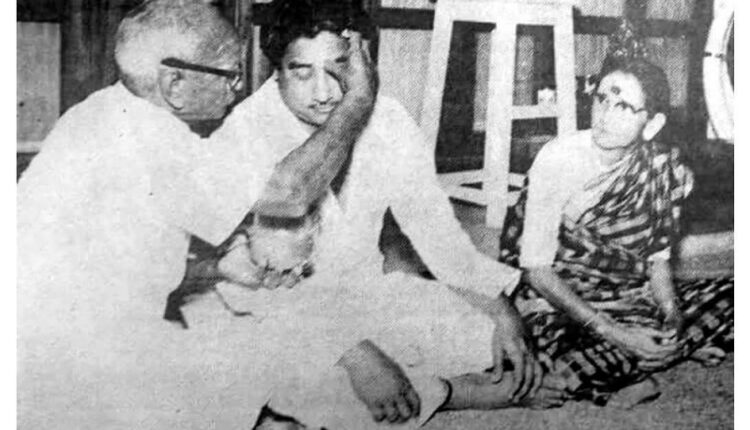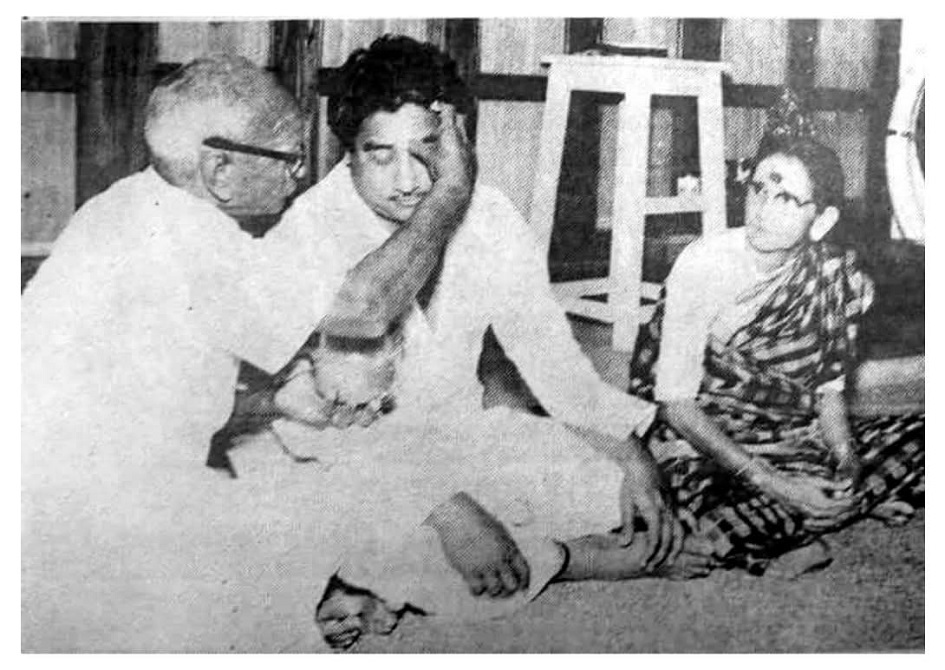 தந்தையைப்போல் ஒரு தெய்வமில்லை என்ற திரைப்படத்திற்கான பாடலுக்காக வாயசைத்த நடிகர் திலகம் சிவாஜி கணேசனுக்கு, அவரது தந்தை நெற்றியில் திலகமிட்டு வாழ்த்த அதைக் கனிவுடன் கவனிக்கிறார் அவருடைய தாயார்.