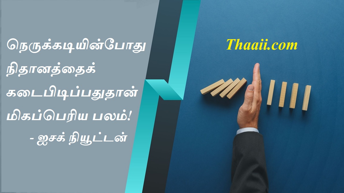 நெருக்கடியிலும் நிதானம் தேவை! கதம்பம் Last updated Jul 28, 2025 Share தாய் சிலேட்: நெருக்கடியின்போது நிதானத்தைக் கடைபிடிப்பதுதான் மிகப்பெரிய பலம்! – ஐசக் நியூட்டன் Share FacebookTwitterGoogle+ReddItWhatsAppPinterestEmail