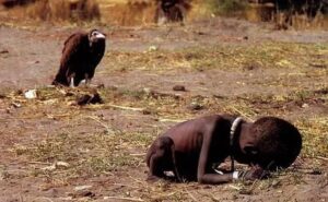 ஊட்டச்சத்து இல்லாத சிறுமி இறப்பதற்காக கழுகு பொறுமையாக காத்திருப்பது இப்படத்தில் பதிவாகியிருந்தது.