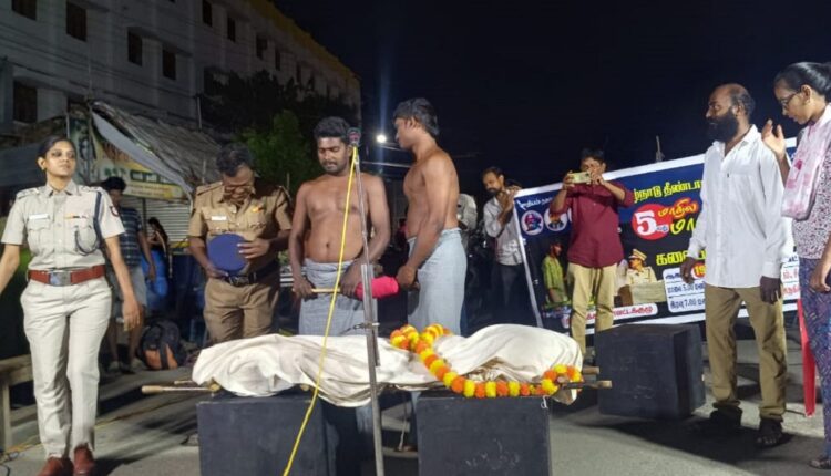 🔥இதன் ஒருபகுதியாக, தோல் பதனிடும் தொழிலாளர்கள், வீரம் செறிந்த போராட்டம் நடத்திய திண்டுக்கலில், தீண்டாமைக்கு எதிராக ‘பட்டாங்கில் உள்ள படி’ என்ற நாடகம், பாடல்களுடன் பொதுமக்கள் முன்னிலையில், தெருவிலேயே அரங்கேற்றம் செய்யப்பட்டது.