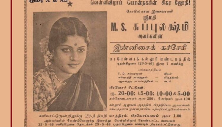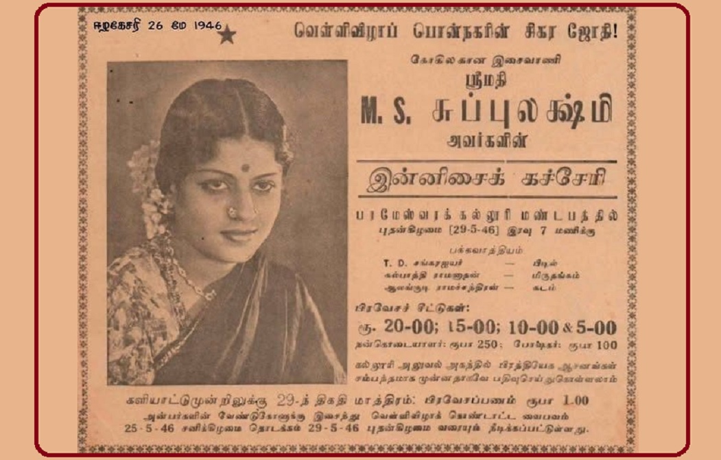 கர்நாடக இசைப் பாடகியான எம்.எஸ்.சுப்புலட்சுமி, யாழ்ப்பாணம் பரமேஸ்வரா கல்லூரியில் 29-05-1946-ல் இன்னிசைக் கச்சேரி நடத்தியபோது வெளிவந்த விளம்பரம்.