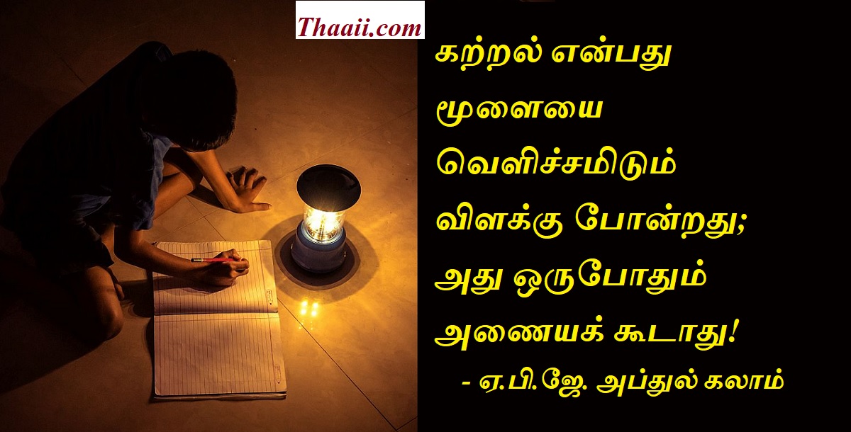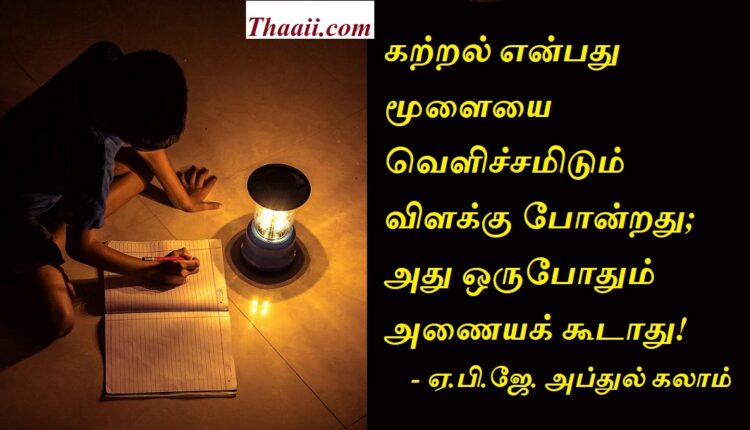 கல்வி என்பது இருளகற்றும் ஒளி! கதம்பம் Last updated Nov 21, 2025 Share தாய் சிலேட்: கற்றல் என்பது மூளையை வெளிச்சமிடும் விளக்கு போன்றது; அது ஒருபோதும் அணையக் கூடாது! – டாக்டர்.ஏ.பி.ஜே. அப்துல் கலாம். Share FacebookTwitterGoogle+ReddItWhatsAppPinterestEmail