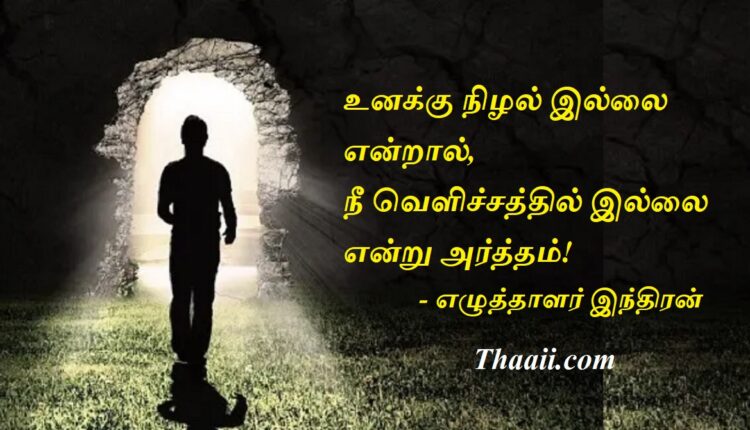 வெளிச்சம் பெற வெளியே வா…! கதம்பம் Last updated Jan 9, 2026 Share தாய் சிலேட்: உனக்கு நிழல் இல்லை என்றால், நீ வெளிச்சத்தில் இல்லை என்று அர்த்தம்! – எழுத்தாளர் இந்திரன் Share FacebookTwitterGoogle+ReddItWhatsAppPinterestEmail