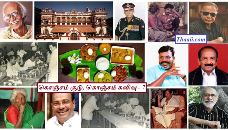 மதுரை, சென்னை உள்ளிட்ட நகரங்களிலும் அவரோடு உணவு அருந்தியிருக்கிறேன். சாப்பிடுவதில் தேர்ந்த ருசியை வெளிப்படுத்தும் அவர், வருகிறவர்களை உபசரிக்கும் விதமும் அவ்வளவு ருசிகரமாக இருக்கும், அன்புமயமாகவும் இருக்கும்.