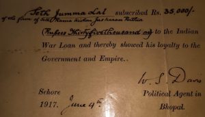 “சேத் ஜும்மா லால் இந்திய போர்க்காலக் கடனுக்காக 35,000 ரூபாயை வழங்கியதன் மூலம் அரசாங்கத்திற்கும் சாம்ராஜ்யத்திற்கும் தனது விசுவாசத்தைக் காட்டியுள்ளார்” என்று அந்த ஆவணத்தில் குறிப்பிடப்பட்டுள்ளது.