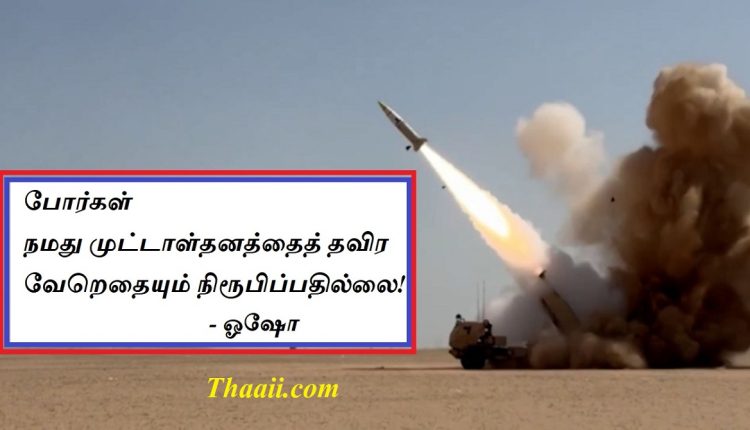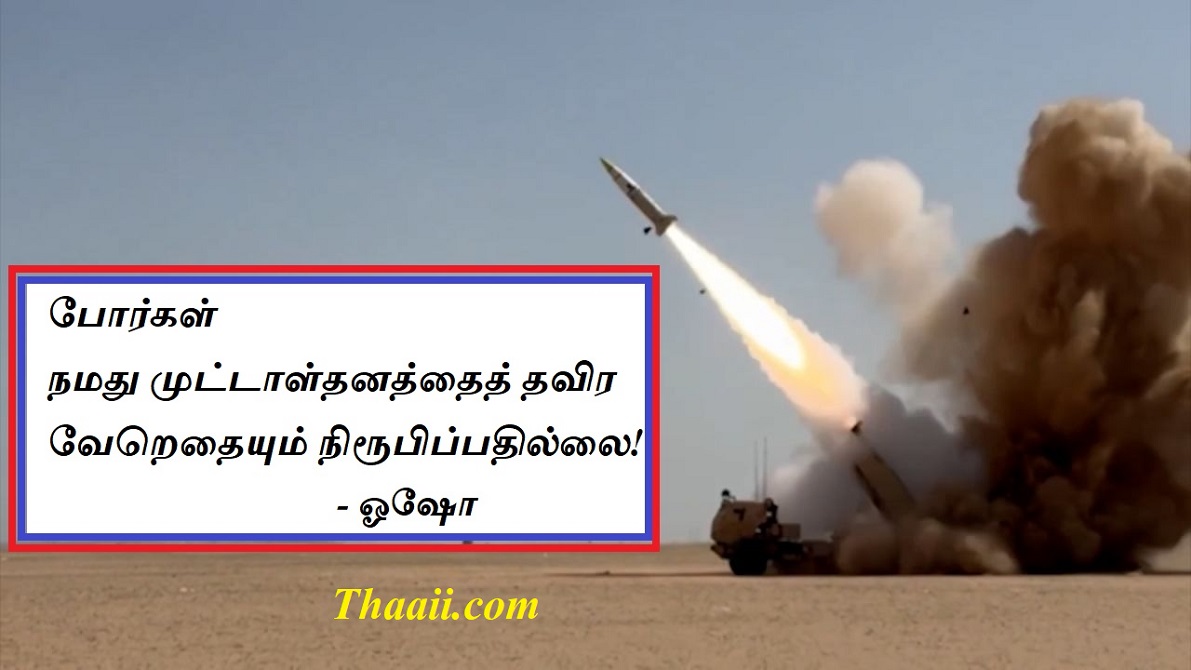 எதை நிரூபிப்பதற்காக இந்தப் போர்கள்? கதம்பம் Last updated Mar 10, 2026 Share தாய் சிலேட்: நமது போர்கள் நமது முட்டாள்தனத்தைத் தவிர வேறெதையும் நிரூபிப்பதில்லை! – ஓஷோ Share FacebookTwitterGoogle+ReddItWhatsAppPinterestEmail